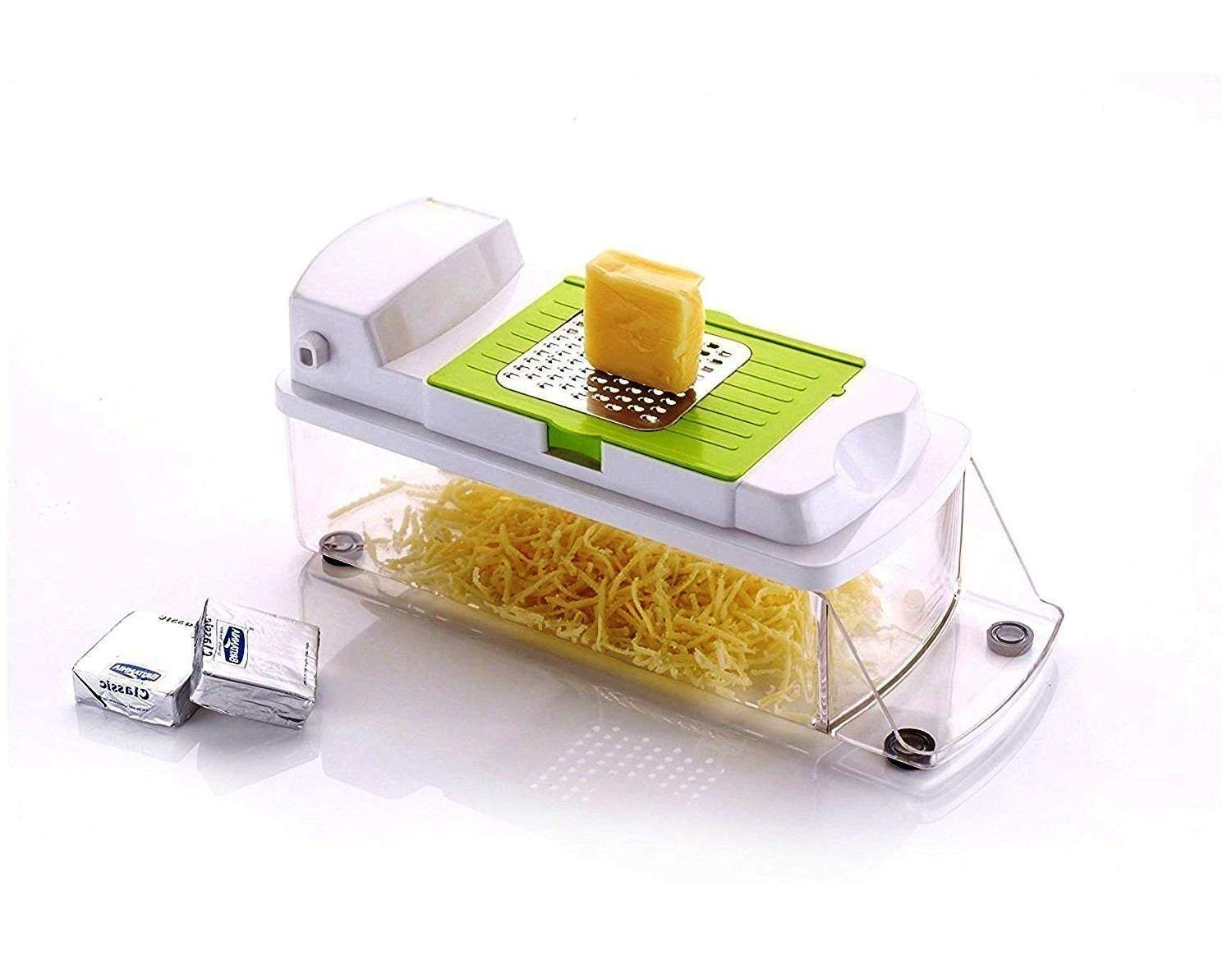 - Large detachable container which can also be used to store vegetable and fruits in refrigerator, Colour: Green, Material: Plastic and Stainless Steel, Shape: Rectangle Package Contents: 1 Plastic Container, 1 peeler, 1 safety holder, 1 masher and 1 handle with cleaning press Blades: 1 dual, 2 slicer, 2 grater, 1 Juliane, blade die attachment